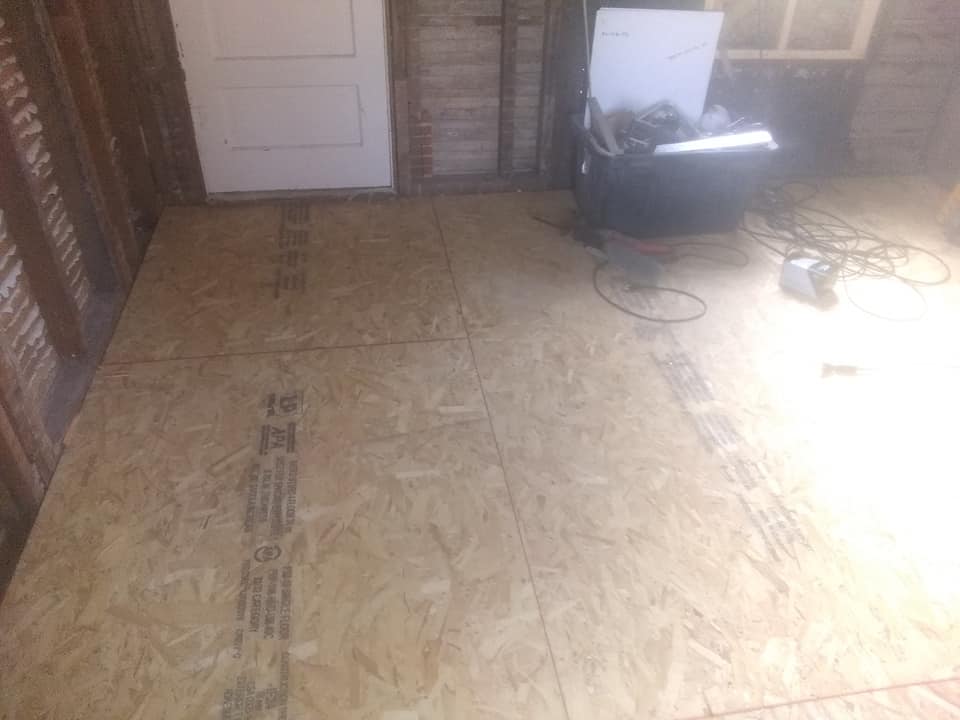 I have finally finished the floor for the bedroom. I added 5 1/2″ EPS foam insulation on the floor, a layer of OSB since the floors in the adjacent rooms were 1/2″ higher and then finished off with 3/4″ tongue and groove sub floor. All this is held together by both floor screws as well…